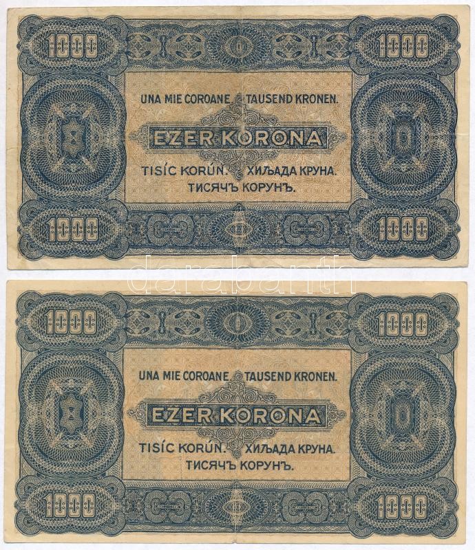 Leírás: 1923. 1000K "Magyar Pénzjegynyomda R.t. Budapest" nyomdahely jelöléssel + 1923. 1000K nyomdahely jelölés nélkül T:III,III-