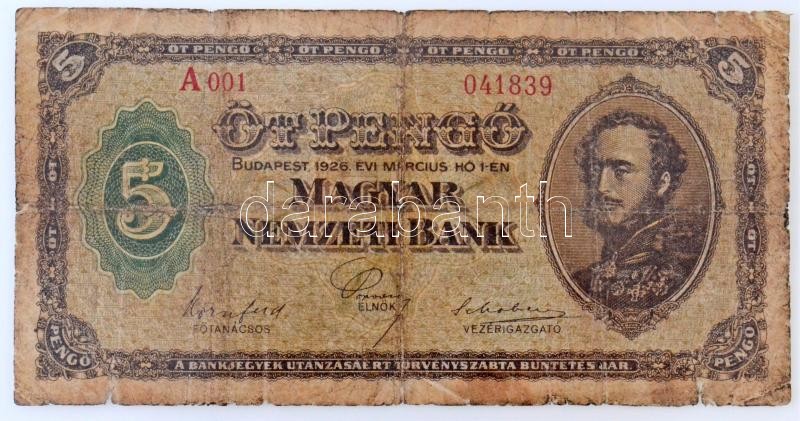 Hungary 1926. 5 Pengő "... https://www.darabanth.com/hu/358-Gyorsarveres/358.0/Numizmatika/Magyar-bankjegyek~2000006/1926-5P-A001-041839-TIV--Hungary-1926-5-Pengo-A001-041839-CG--Adamo-P3~II2058580