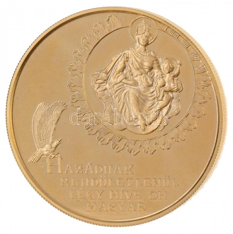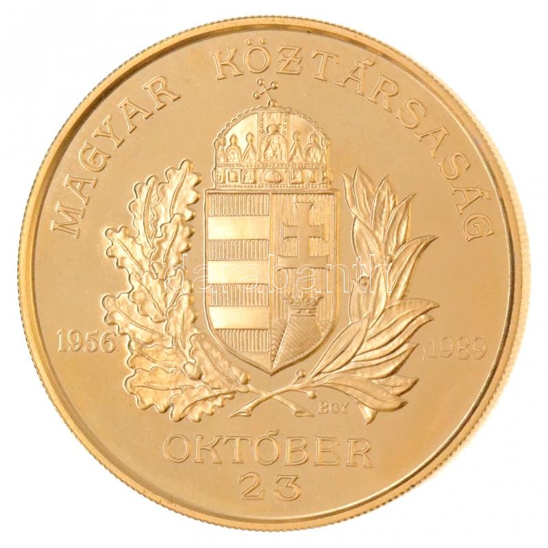 Leírás: Bognár György (1944-) 1990. "Magyar Köztársaság 1956-1989. Október 23. / Hazádnak rendületlenül légy híve, oh magyar" aranyozott piefort emlékérem, dísztokban (65mm) T:PP ujjlenyomat
