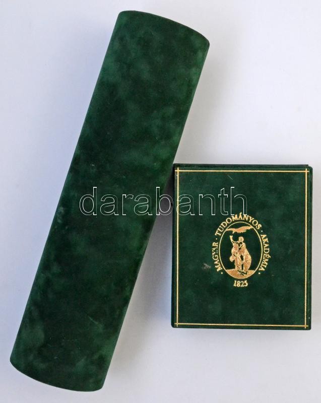 Leírás: Bognár György (1944-) 2011. "Eötvös József koszorú" jelzett Ag díjplakett, eredeti "MTA" dísztokban, adományozói oklevéllel (117,45g/0.925/60mm) T:1-