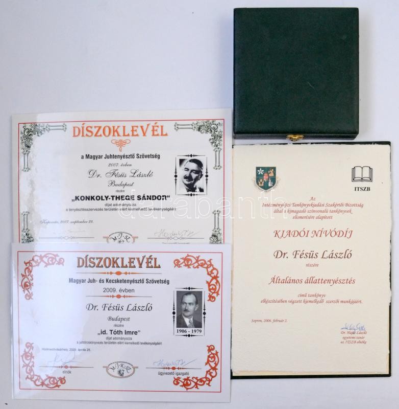 Melocco Miklós (1935-) 1996. Herceghalom - Tangl Ferenc / Állattenyésztési és Takarmányozási Kutatóintézet" Br emlékplakett eredeti dísztokban (120mm) + 3db adományozói oklevél "id. Tóth Imre díj", "Konkoly-Thege Sándor díj", "Kiadói Nívódíj" T:1-