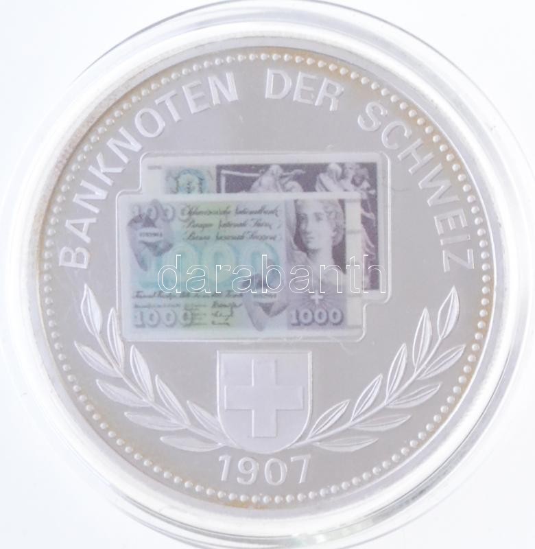 Leírás: Svájc DN "Banknoten der Schweiz 1907 / Billets de Banque de Suisse - Banconote della Svizzera" ezüstözött Cu-Ni emlékérem 1000Fr svácji bankegy multicolor képével (40mm) T:PP
