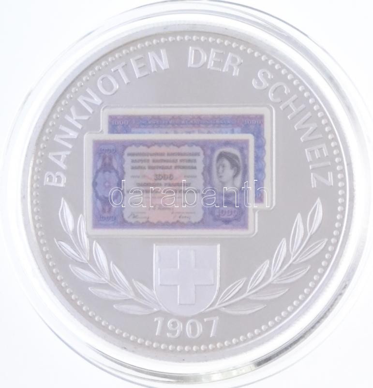 Svájc DN "Banknoten der Schweiz 1907 / Billets de Banque de Suisse - Banconote della Svizzera" ezüstözött Cu-Ni emlékérem 1000Fr svájci bankjegy multicolor képével, tanúsítvánnyal (40mm) T:PP