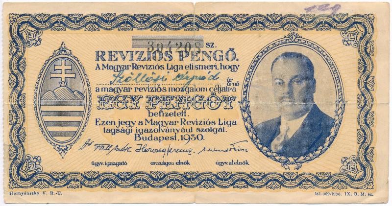 Leírás: Budapest 1930. "Revíziós Pengő" arcképes változat, kitöltött, hátoldalán felülbélyegzés T:III-,IV
