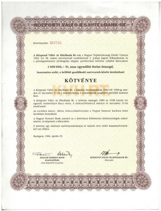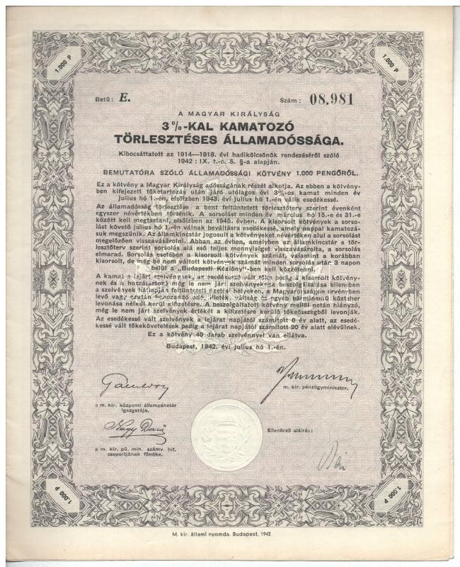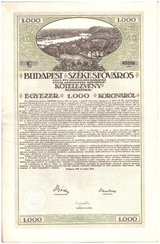 Budapest 1918. "Budapest Székesfőváros" kötelezvény 1000K-ról, magyar és német nyelven, szelvényekkel, szárazpecsétte + 1942. "A Magyar Királyság 3%-kal Kamatozó Törlesztéses Államadóssága" kötvény 1000P-ről szelvényekkel és szárazpecséttel + 1984. "Központi Váltó- és Hitelbank Rt" kötvénye 1.000.000Ft-ról T:II