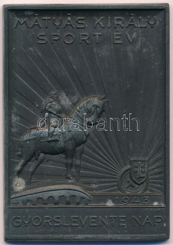 Leírás: 1943. "Mátyás Király Sport Év Gyorslevente Nap" hadifém plakett, hátoldalon "LUDVIG" gyártói jelzés (50x70mm) szign.: P.Bak T:1- oxidáció