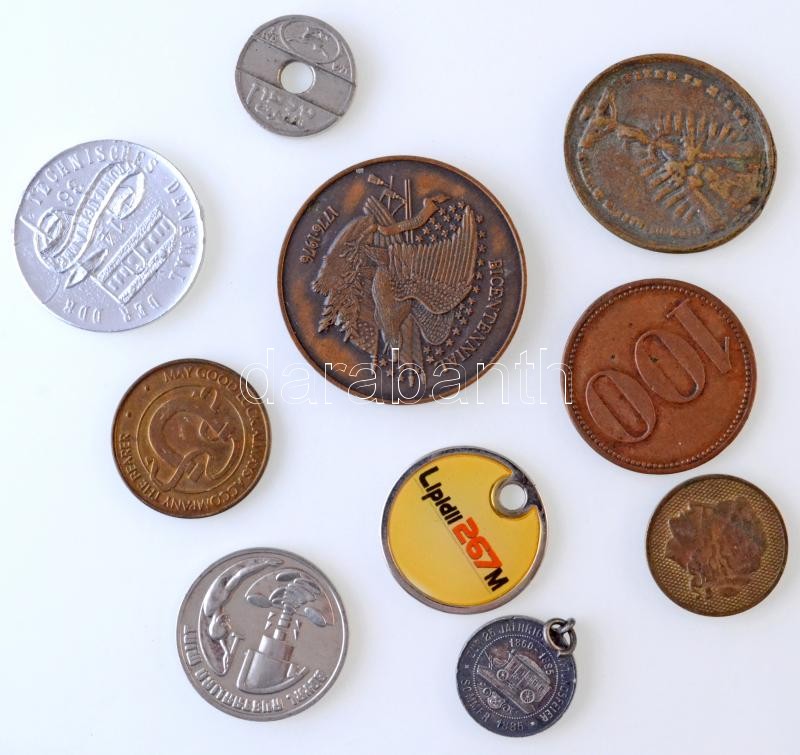 10db-os vegyes külföldi emlékérem tétel, közte "ZUR 25 JAEHRIGEN STIFTUNGSFEIER SOMMER 1885 / DER MITGLIEDERN DER GESELLSCHAFT STELLWAGEN VON DEN FRAUEN DES VEREINS GEWIDMET" emlékmedál füllel, "TECHNISCHES DENKMAL DER DDR" Al emlékérem T:1-,2,