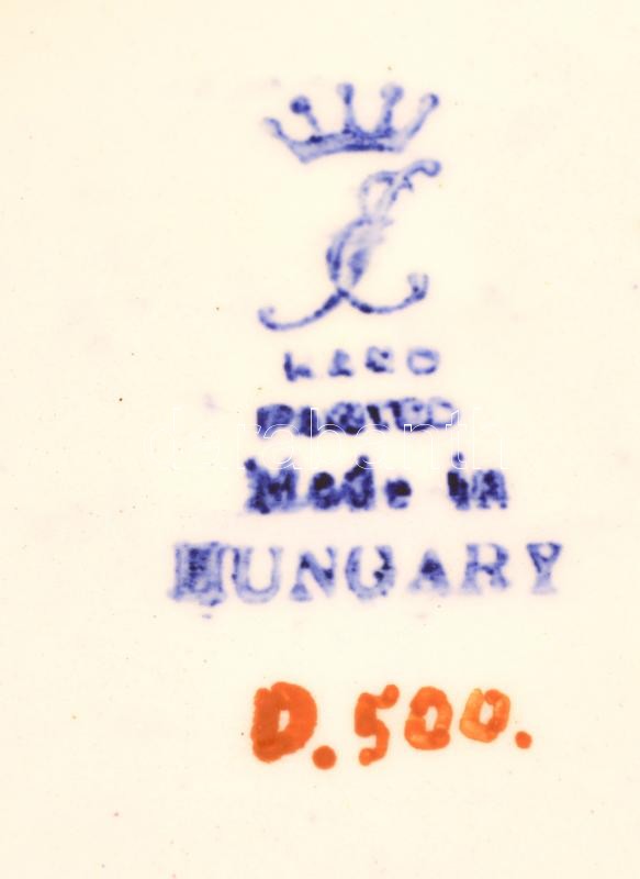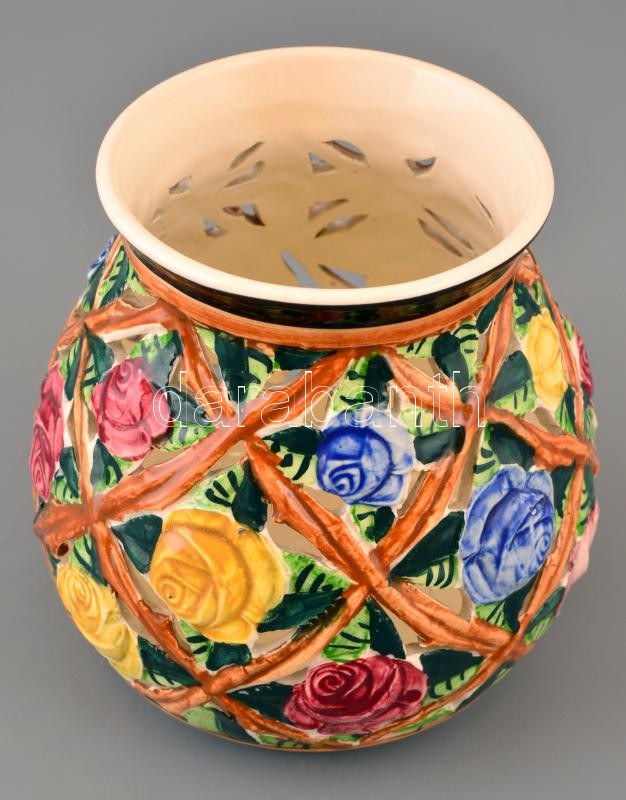 Leírás: Fischer Emil áttört váza, kézzel festett mázas porcelánfajansz, jelzett, nagyon apró máz hiánnyal, m: 13 cm