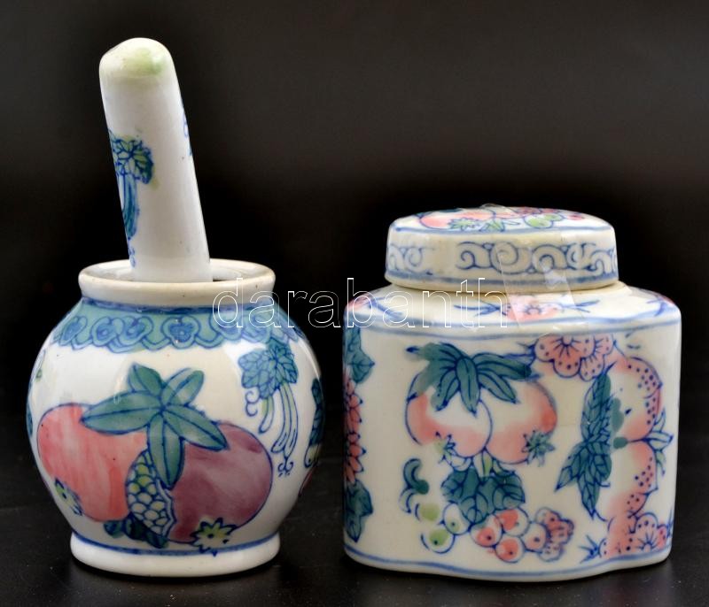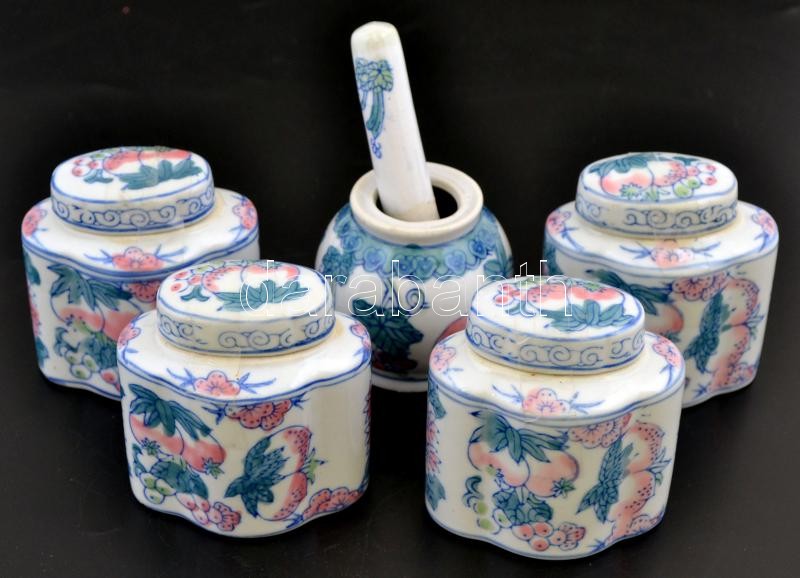 Leírás: Kínai porcelán készlet, 4 db fűszertartó + mozsár törővel, kézzel festett, jelzés nélkül, m: 7 és 8 cm