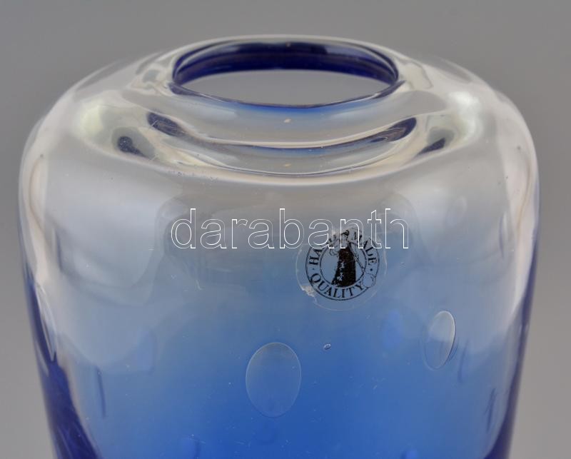 Leírás: Buborékos, anyagában színezett üveg váza, matricával jelzett, kis kopásnyomokkal, m: 20 cm