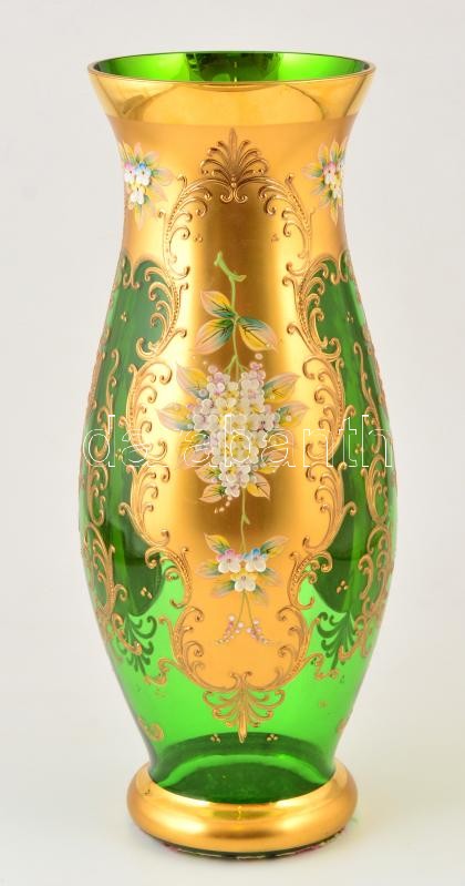 Leírás: Jelzés nélkül: Nagyméretű, aranyozott, festett üveg díszváza. 42 cm
