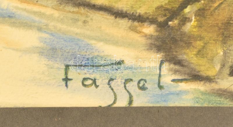 Leírás: Fassel jelzéssel: Házak a patakpartnál. Akvarell, papír, üvegezett keretben, 34×46 cm