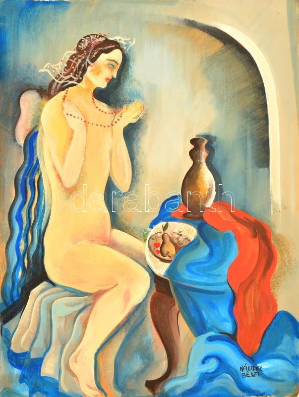 Leírás: Kádár jelzéssel: Piros gyöngyös akt. Tempera, karton, foltos, 64×47 cm