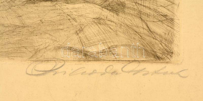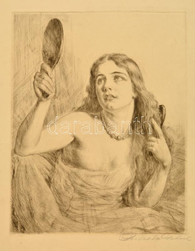 Leírás: Prihoda István (1891-1956):Fésülködő lány Rézkarc, papír, jelzett, 34,5×26,5 cm