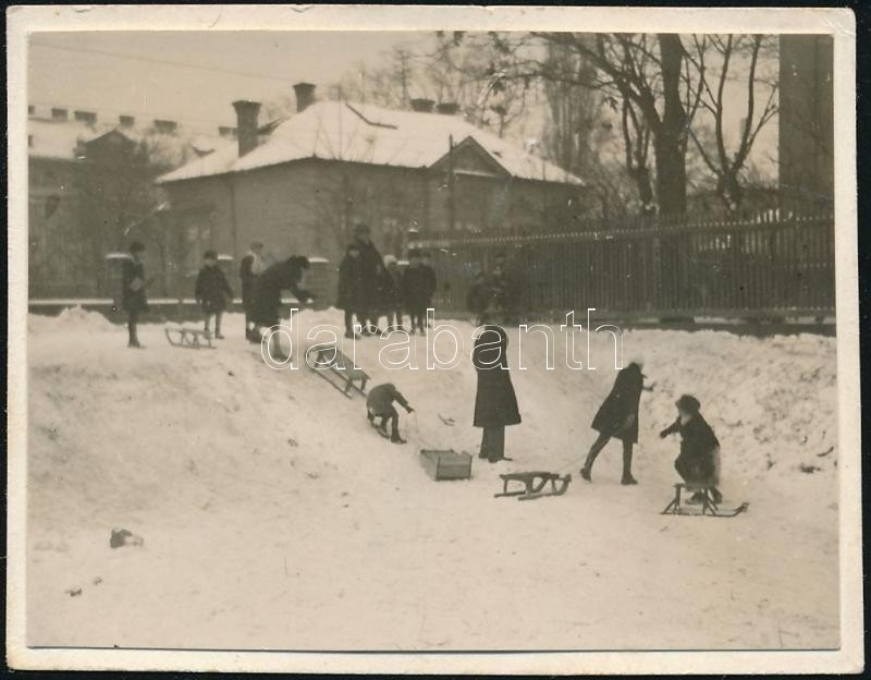 1931. január 20. Kinszki Imre (1901-1945) budapesti fotóművész hagyatékából, jelzés nélküli, a szerző által feliratozott vintage fotó (Szánkózók), 4x5 cm