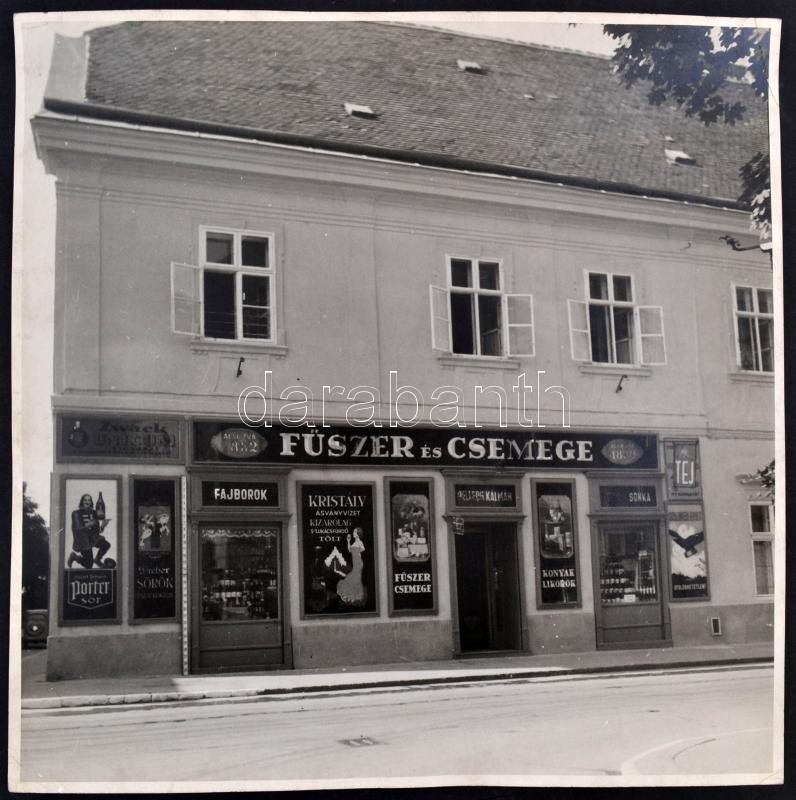 cca 1930-1940 Budai vár, Úri utca-Szentháromság utca sarka, Pál-Farkasdy-OTP társasház, Fűszer és Csemege üzlet, reklámtáblákkal, (a háborúban megsemmisült, majd elbontották), fotó, jelzés nélkül, az egyik sarkán törésnyommal, 40x40 cm