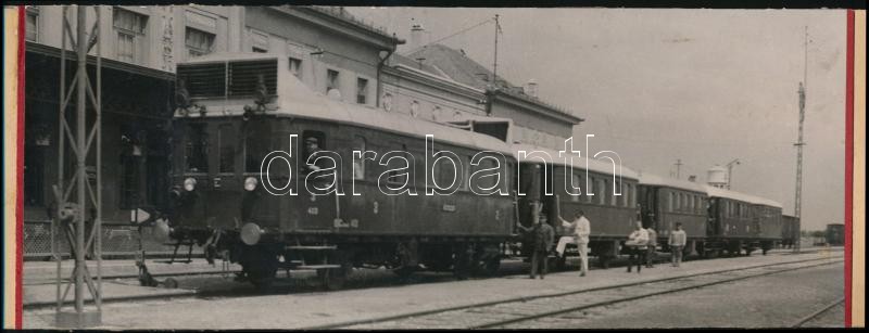 Leírás: cca 1940 MÁVAG dízel mozdony állomáson. 29x11 cm Kartonon