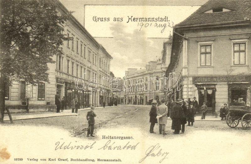 1901 Nagyszeben, Hermannstadt, Sibiu; Heltauergasse / Disznódi utca, Julius Wermesther, Carl Landmann üzlete, Transsylvania szálloda. Karl Graef kiadása / street view, shops, hotel