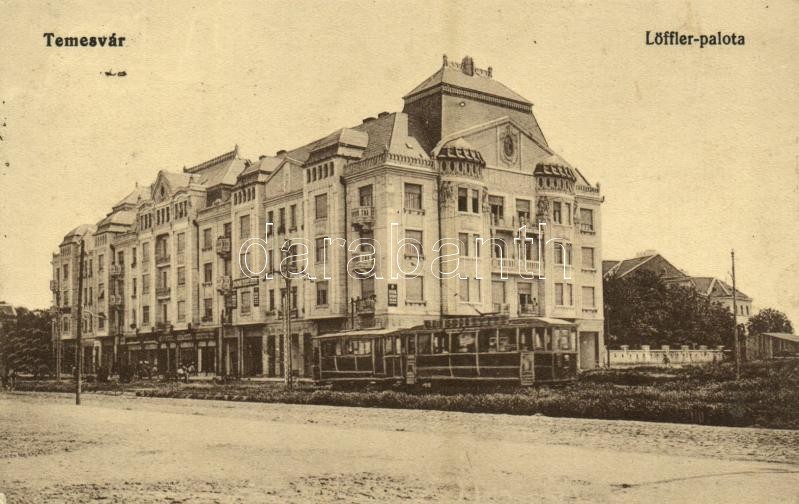 Leírás: 1915 Temesvár, Timisoara; Löffler palota, villamos, Duna biztosító, üzletek. Kiadja Polatsek / tenement palace, tram, insurance company, shops
