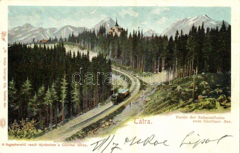 1901 Tátra, Magas Tátra, Vysoké Tatry; A fogaskerekű vasút tájrészlete a Csorbai tóhoz. Feitzinger Ede 4 bt. / Partie der Zahnradbahn zum Csorbaer-See / Strbské pleso / cogwheel railway to the lake