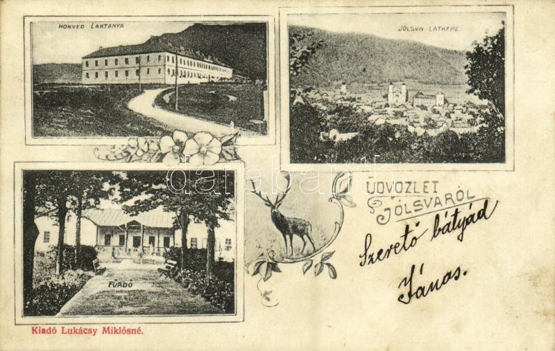 Leírás: 1909 Jolsva, Jelsava; Honvéd laktanya, látkép, fürdő. Kiadja Lukácsy Miklósné / K.u.K. military barracks, general view, spa, baths. Art Nouveau, floral (fl)