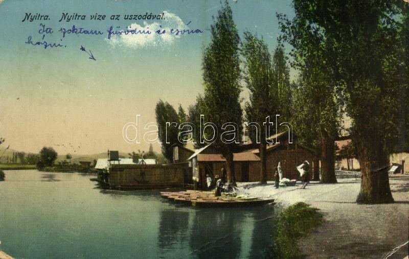 Leírás: 1916 Nyitra, Nitra; Nyitra vize az uszodával, evezős csónakok / Nitra riverbank, swimming bool, rowing boats (EB)