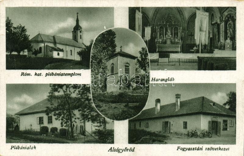 1944 Alsógyőröd, Maly Jurad, Dolny Dur (Nagygyőröd, Velky Dur); Római katolikus plébániatemplom, belső, Harangláb, Plébánia lak, kerékpár, Hanza Fogyasztási Szövetkezet üzlete és saját kiadása / Catholic parish church, interior, belfry, rectory, bicycle, cooperative shop (EK)