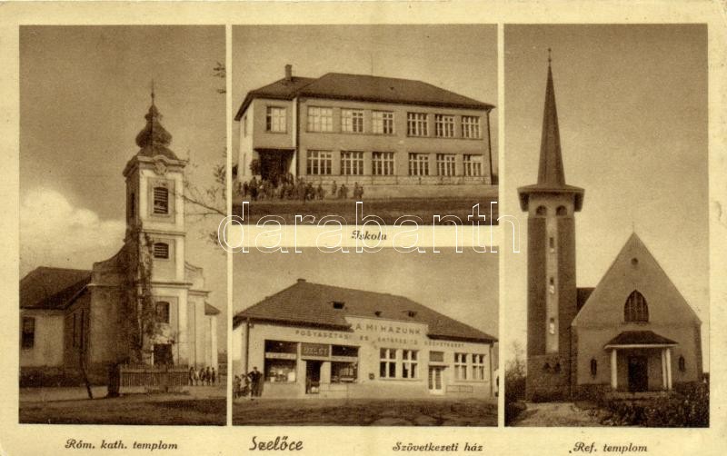 Leírás: Szelőce, Sókszelőce, Selice; Római katolikus templom, Iskola, Református templom, Fogyasztási Szövetkezet üzlete és saját kiadása / Catholic church, school, Calvinist church, cooperative shop (ázott sarkak / wet corners)