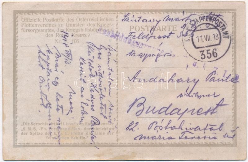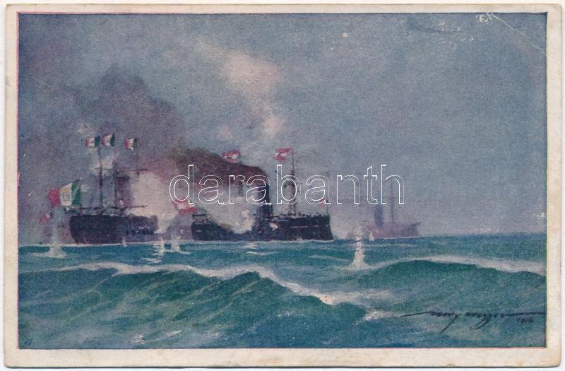 Die Seeschlacht bei Lissa. SMS Erzherzog Ferdinand Max durchbricht an der Spitze der k.u.k. Flotte die Linie der feindlichen Schiffe. K.u.K. Kriegsmarine. Kriegshilfsbüro Nr. F. 105. / Az SMS Erzherzog Ferdinand Max csatahajó áttöri az ellenséges hajók vonalát a lissai csatában / Battle of Lissa (1866), flagship SMS Erzherzog Ferdinand Max breaks through the enemy ships line s: Harry Heusser + 1918 Ausbildungsgruppe K.u.K. 7. I. D. (EK)