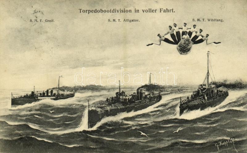 Leírás: Torpedobootdivision in voller Fahrt / SMS Greif, SMS Alligator, I. osztályú torpedónaszádok, SMS Wildfang Huszár-típusú torpedóromboló (Zerstörer), matrózok / WWI K.u.K. Kriegsmarine destroyers, torpedoboat, mariners. G. Fano Pola 1908 s: G. Kappler (EK)