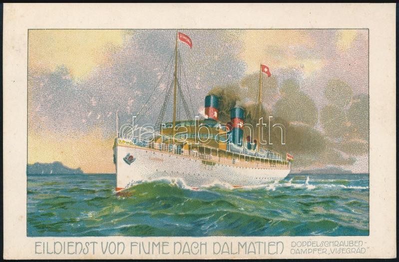Leírás: 1914 "Visegrád" kétcsavaros tengeri személyszállító gőzhajó / Eildienst von Fiume nach Dalmatien. Doppelschraubendampfer "Visegrád" / Hungarian twin screw sea-going passenger steamer, litho + "CATTARO-FIUME TENGERI POSTA"