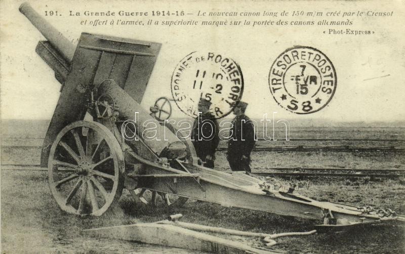 1915 La Grande Guerre, Le nouveau canon long de 150 mm créé par le Creusot et offert a l'armée, il supériorite marque sur la portée des canons allemands / WWI French military, 150 mm howitzer