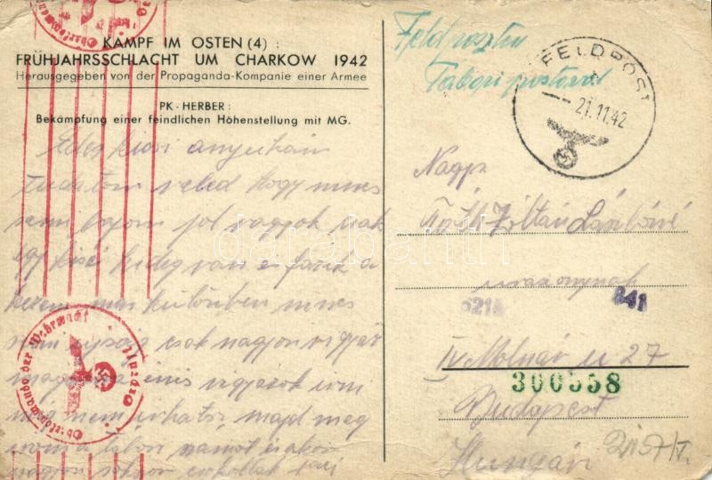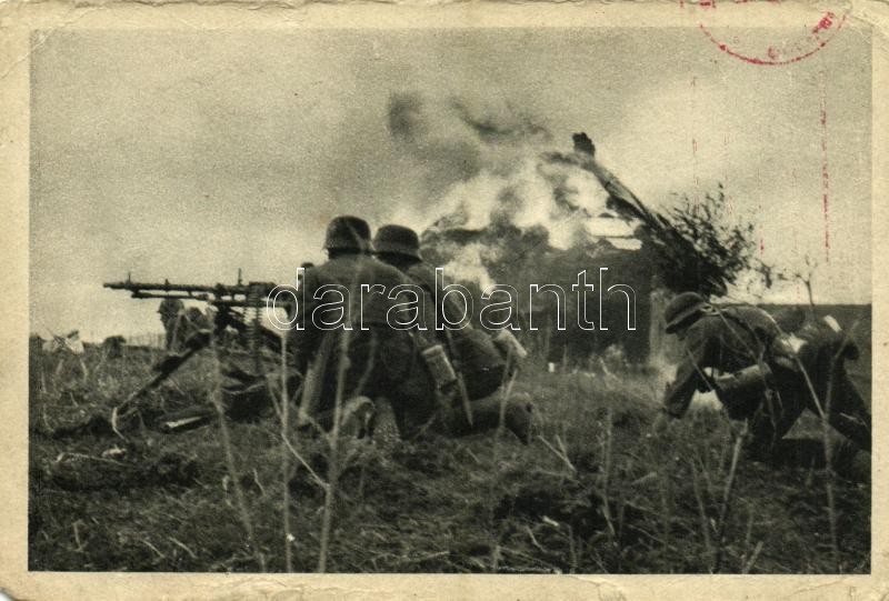 1942 Kampf im Osten. Frühjahrsschlacht um Charkow. Bekämpfung einer feindlichen Höhenstellung mit MG / WWII Wehrmacht military (armed forces of Nazi Germany), machine gun, combat near Kharkiv (Ukraine) + "Feldpost" "Oberkommando der Wehrmacht Geprüft" (kis szakadások / small tears)