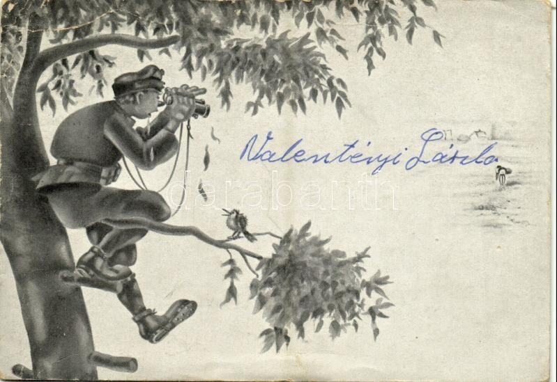 ~1941 Határvadász élet. A magas figyelő igyekezzék az ellenség viszonyaiba való betekintésre! Kerekes Lajos határvadász rajza 20. po. sz. / WWII Hungarian military art postcard, border watch (EB)