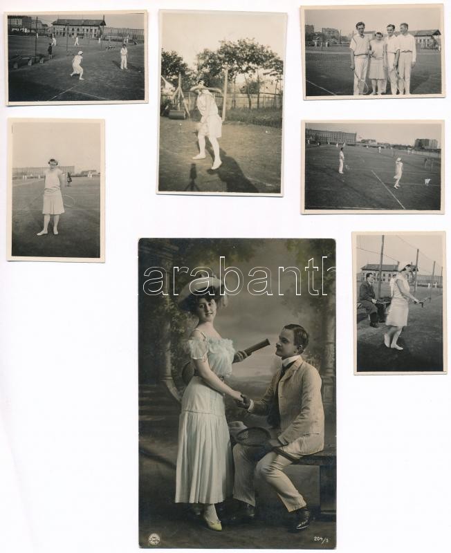 Leírás: 11 db RÉGI sport fotó és képeslap motívum: tenisz / 11 pre-1945 sport motive photos and postcards: tennis