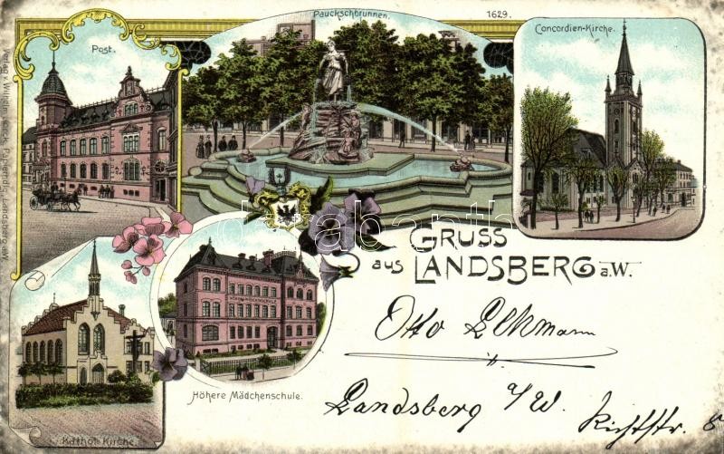1898 Gorzów Wielkopolski, Landsberg an der Warthe; Post, Pauckschbrunnen, Concordien-Kirche, Kathol. Kirche, Höhere Mädchenschule / post office, fountain, churches, girls school. Verlag v. Wilhelm Jorck 1629. Art Nouveau, floral, litho