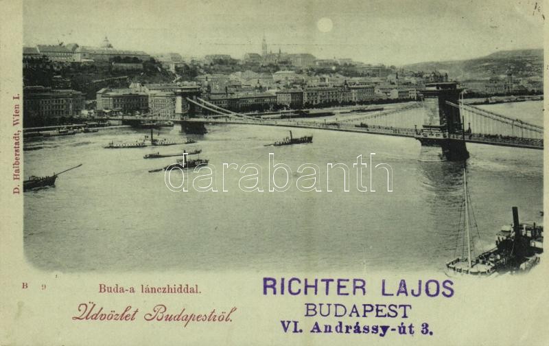 Leírás: 1898 Budapest, Buda és Lánchíd, gőzhajók. D. Halberstadt B 9. (EK)