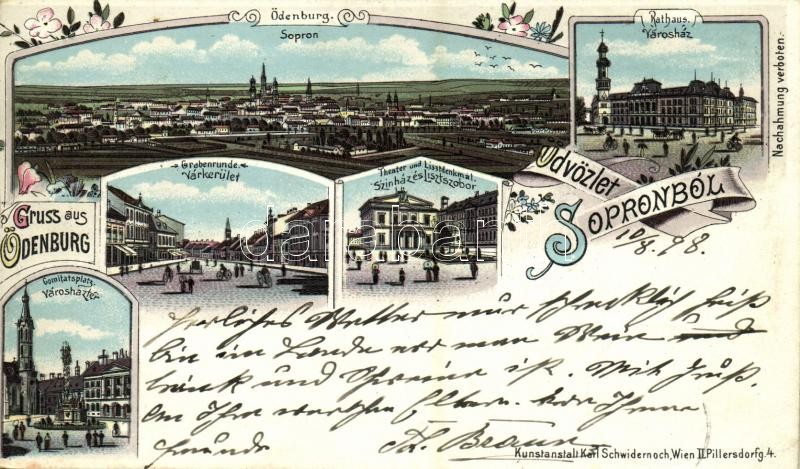Leírás: 1898 Sopron, Várkerület, Városház tér, Színház, Liszt szobor. Kunstanstalt Kalr Schwidernoch Art Nouveau, floral, litho (vágott / cut)