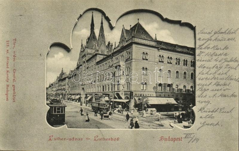 Leírás: 1900 Budapest VIII. Rákóczi út (Kerepesi út), Luther udvar, Munkácsy kávéház, villamos, üzletek. Divald Károly 212. sz.