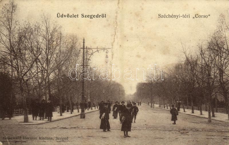 Leírás: 1907 Szeged, Széchenyi téri "Corso", korzó, újságárus. Kiadja Grünwald Herman (fa)
