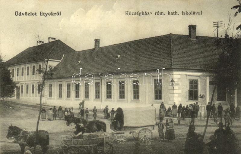 1913 Etyek, Községháza, Római katolikus iskola, lovasszekerek https://www.darabanth.com/hu/359-Gyorsarveres/359.0/Kepeslapok/Magyarorszag~1000004/1913-Etyek-Kozseghaza-Romai-katolikus-iskola-lovasszekerek~II2067646