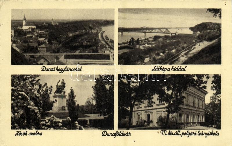 Leírás: 1936 Dunaföldvár, Dunai hegyláncolat, látkép a híddal, Hősök szobra, emlékmű, M. kir. állami polgári leányiskola. Kiadja Somló Manó (fa)