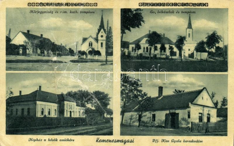 1944 Kemenesmagasi, Körjegyzőség és Római katolikus templom, Evangélikus lelkészlak és templom, Népház a hősök emlékére, Ifj. Kiss Gyula üzlete és saját kiadása (gyűrődés / crease)