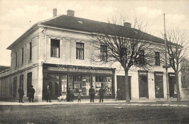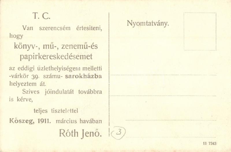 Leírás: Kőszeg, Róth Jenő könyvüzlete a hátoldalon reklámmal, Decker fodrászata