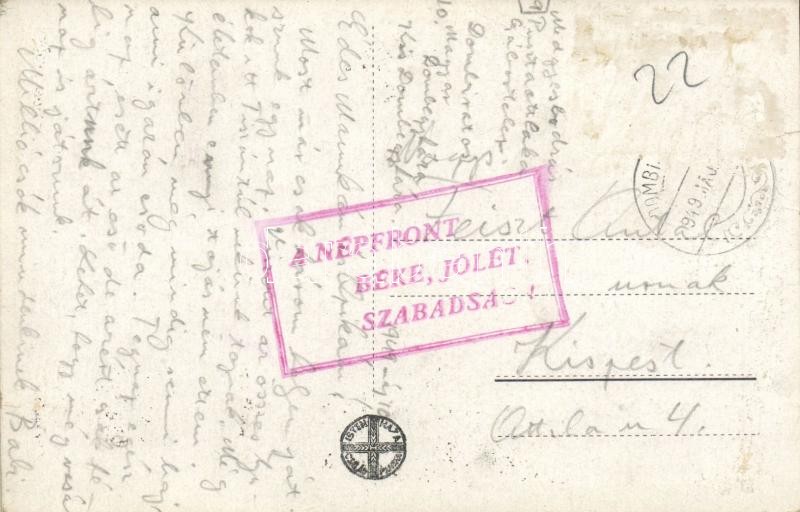Leírás: Medgyesbodzás, Plébánia, Templom, Iskola, Községháza, Hangya Szövetkezet üzlete + "1949 A Népfront béke, jólét, szabadság!"