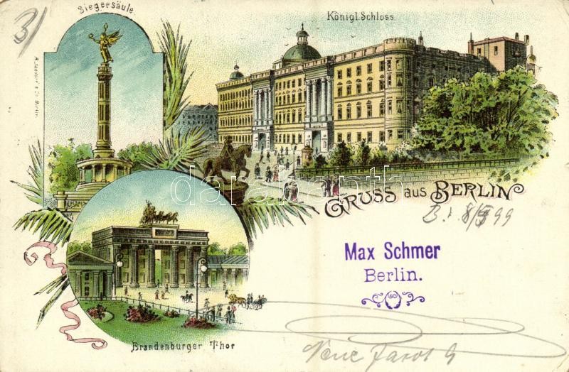 1899 Berlin, Siegersäule, Königl Schloss, Brandenburger Thor / monumen... https://www.darabanth.com/hu/359-Gyorsarveres/359.0/Kepeslapok/Nemetorszag~1000048/1899-Berlin-Siegersaule-Konigl-Schloss-Brandenburger-Thor-monument-castle-gate-A-Jandorf-~II2067194