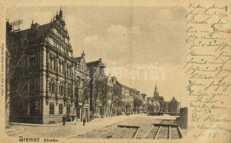 1899 Bremen, Schlachte / quay, harbor. Phot. & Verl. v. Louis Koch https://www.darabanth.com/hu/359-Gyorsarveres/359.0/Kepeslapok/Nemetorszag~1000048/1899-Bremen-Schlachte-quay-harbor-Phot-Verl-v-Louis-Koch~II2067485