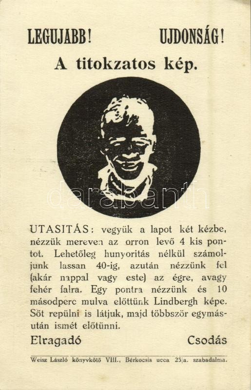 Legújabb! Újdonság! Titokzatos kép. Charles Lindbergh amerikai pilóta optikai illúziós lapon. Weisz László könyvkötő szabadalma / Hungarian optical illusion postcard with American pilot, Charles Lindbergh (EK)