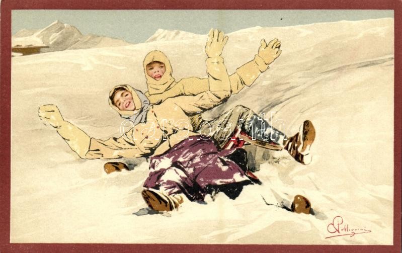Leírás: Winter sport art postcard. Sledding. Vouga & Cie No. 103. litho s: Pellegrini