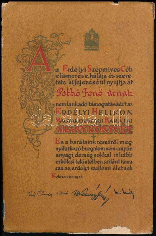 Leírás: Az Erdélyi Helikon Magyarországi Barátainak Aranykönyve 1937. Kolozsvár, 1937, Erdélyi Szépmíves Céh. Kiadói papírkötés, kiadói papír védőborítóban, szakadozott védőborítóban, intézményi bélyegzőel.